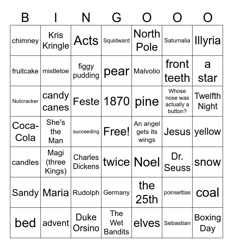 This bingo card has a free space and 55 words: elves, Twelfth Night, reindeer, chimney, She's the Man, Maria, Illyria, golden rings, mistletoe, Rudolph, Squidward, snow, yellow, Jesus, bed, candles, North Pole, Malvolio, Sebastian, front teeth, a star, Magi (three Kings), pine, Acts, cookies, fruitcake, succeeding, Cupid, Nutcracker, Whose nose was actually a button?, egg nog, Dr. Seuss, coal, advent, Saturnalia, pear, Sandy, candy canes, Boxing Day, Charles Dickens, Kris Kringle, Germany, the 25th, green, Feste, Coca-Cola, Duke Orsino, Noel, An angel gets its wings, figgy pudding, twice, poinsettias, The Wet Bandits, 1870 and maple syrup.