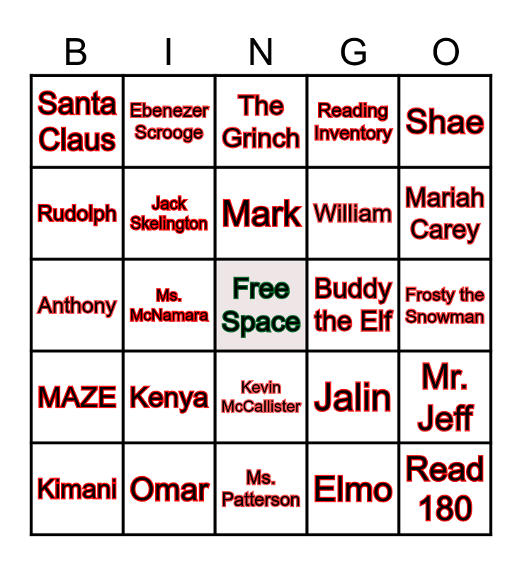 This bingo card has a free space and 24 words: Kenya, Omar, Mark, Kimani, Shae, Santa Claus, Rudolph, Ebenezer Scrooge, Buddy the Elf, Kevin McCallister, William, Anthony, Jalin, Mr. Jeff, Jack Skelington, Elmo, Frosty the Snowman, The Grinch, Mariah Carey, Ms. McNamara, Read 180, MAZE, Reading Inventory and Ms. Patterson.