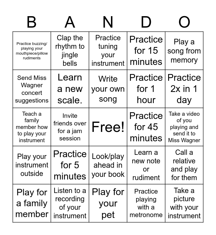 This bingo card has a free space and 24 words: Practice for 5 minutes, Listen to a recording of your instrument, Write your own song, Play for a family member, Play a song from memory, Practice buzzing/ playing your mouthpiece/pillow rudiments, Send Miss Wagner concert suggestions, Clap the rhythm to jingle bells, Practice for 45 minutes, Look/play ahead in your book, Practice for 1 hour, Teach a family member how to play your instrument, Learn a new note or rudiment, Call a relative and play for them, Learn a new scale., Practice playing with a metronome, Take a video of you playing and send it to Miss Wagner, Practice tuning your instrument, Practice 2x in 1 day, Invite friends over for a jam session, Take a picture with your instrument, Play your instrument outside, Practice for 15 minutes and Play for your pet.