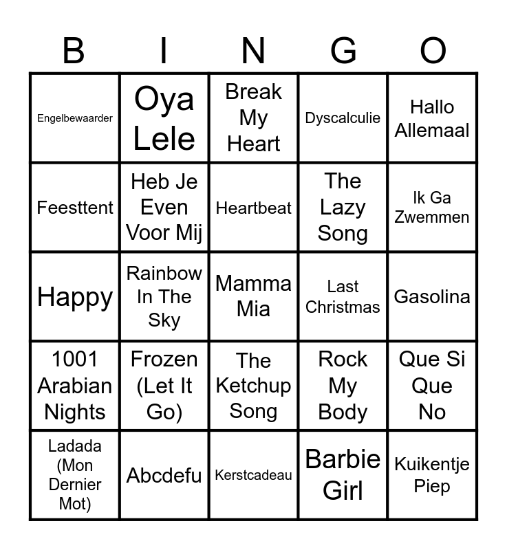 This bingo card has 80 words: Blue (Da Ba Dee), Brabant, Break My Heart, Can't Stop The Feeling, Captain Jack, Celestial, Chemical, Con Calma, Cotton Eye Joe, Crazy Frog, Dance The Night, De Vloer Is Lava, Dyscalculie, Engelbewaarder, Esta Vida, Feesttent, Flowers, Frozen (Let It Go), Gangnam Style, Gasolina, Hallo, Hallo Allemaal, Happy, Heartbeat, Heb Je Even Voor Mij, Hero, HUTS, I Gotta Feeling, I Like To Move It, Ik Ben Kachel, Ik Ga Zwemmen, Kabouterdans, Kerstcadeau, Kuikentje Piep, Ladada (Mon Dernier Mot), Last Christmas, Lief Klein Konijntje, Links Rechts, Macarena, Mamma Mia, Merry Christmas, Miracle, Never Gonna Not Dance Again, Not Fair, Ons Moeder Zeej Nog, Oya Lele, Paracetamollen, Parijs, People, Pepas, Que Si Que No, Rainbow In The Sky, Rock My Body, Runaway, Schultenbräu, Star Walkin', Substitution, Tarzan & Jane, Tattoo, The Ketchup Song, The Lazy Song, Therapie, Trompeta, Van Mij Zijn, Viben, Vluchtstrook, Waka Waka (Time For Africa), Wake Me Up, We Will Rock You, Whistle, 1001 Arabian Nights, Abcdefu, All I Want For Christmas Is You, Anti-Hero, Baby Don't Hurt Me, Baby Shark, Barbie Girl, Beuk De Ballen Uit De Boom, Blah Blah Blah and Blinding Lights.