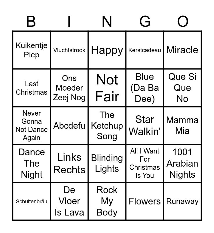 This bingo card has 80 words: Hallo, Hallo Allemaal, Happy, Heartbeat, Heb Je Even Voor Mij, Hero, HUTS, I Gotta Feeling, I Like To Move It, Ik Ben Kachel, Ik Ga Zwemmen, Kabouterdans, Kerstcadeau, Kuikentje Piep, Ladada (Mon Dernier Mot), Last Christmas, Lief Klein Konijntje, Links Rechts, Macarena, Mamma Mia, Merry Christmas, Miracle, Never Gonna Not Dance Again, Not Fair, Ons Moeder Zeej Nog, Oya Lele, Paracetamollen, Parijs, People, Pepas, Que Si Que No, Rainbow In The Sky, Rock My Body, Runaway, Schultenbräu, Star Walkin', Substitution, Tarzan & Jane, Tattoo, The Ketchup Song, The Lazy Song, Therapie, Trompeta, Van Mij Zijn, Viben, Vluchtstrook, Waka Waka (Time For Africa), Wake Me Up, We Will Rock You, Whistle, 1001 Arabian Nights, Abcdefu, All I Want For Christmas Is You, Anti-Hero, Baby Don't Hurt Me, Baby Shark, Barbie Girl, Beuk De Ballen Uit De Boom, Blah Blah Blah, Blinding Lights, Blue (Da Ba Dee), Brabant, Break My Heart, Can't Stop The Feeling, Captain Jack, Celestial, Chemical, Con Calma, Cotton Eye Joe, Crazy Frog, Dance The Night, De Vloer Is Lava, Dyscalculie, Engelbewaarder, Esta Vida, Feesttent, Flowers, Frozen (Let It Go), Gangnam Style and Gasolina.