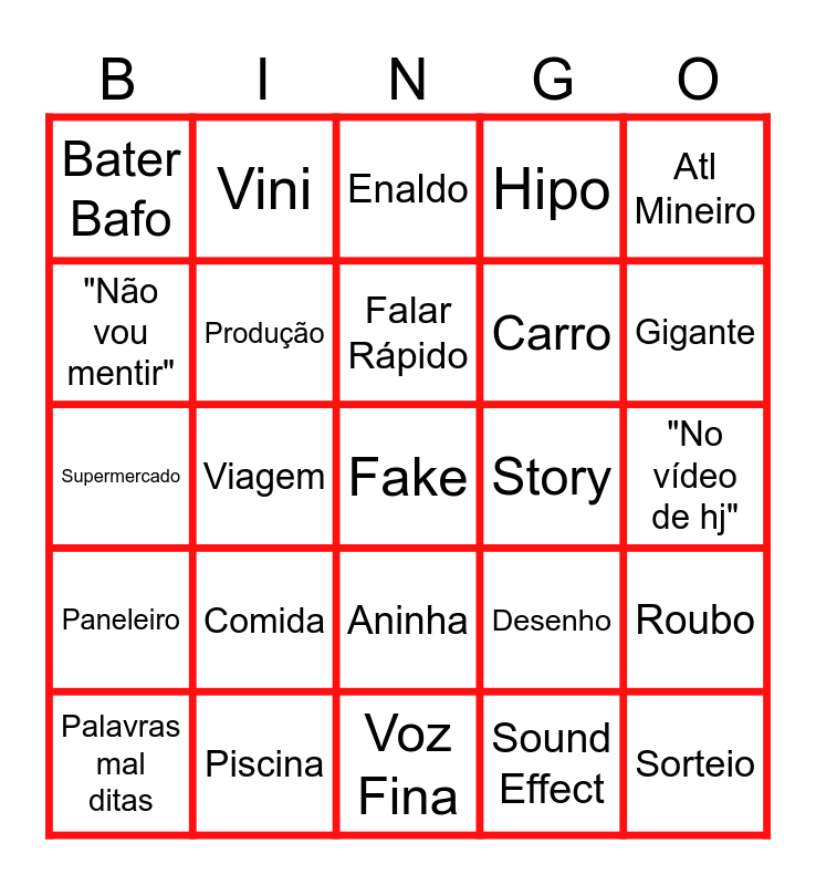 This bingo card has a free space and 54 words: Lag, Paneleiro, Ir ao Shopping, Cortes, Aninha, Patrocínio, Hipo, Figurinha, "Não vou mentir", Foco na Cara, Bater Bafo, Casa, Piscina, Palavras mal ditas, Desafios com Dinheiro, Voz Fina, Sorteio, Carro, Random Reações, "No vídeo de hj", Desenho, Brinquedos, Story, Atl Mineiro, Fernandinho, Vini, Coleção, Família, Musica Repetida, Sound Effect, Nicolas, Brenner, Gordo, Cap, Enaldo, Massinha, Supermercado, Roubo, Contactos, Produção, Luís Bafo Bafo, Whatsapp, Berros, Falar do seu Álbum, Comida, Fast Food, Blz, Demorou, Falar Rápido, Viagem, Gigante, Passei a Noite, Elo and Mini.
