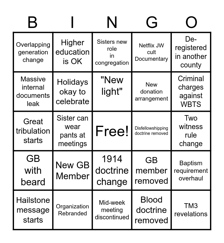 This bingo card has a free space and 24 words: New GB Member, Organization Rebranded, "New light", Hailstone message starts, De-registered in another county, Overlapping generation change, Massive internal documents leak, Higher education is OK, Disfellowshipping doctrine removed, 1914 doctrine change, New donation arrangement, Great tribulation starts, GB member removed, Baptism requirement overhaul, Holidays okay to celebrate, Blood doctrine removed, Two witness rule change, Sisters new role in congregation, Criminal charges against WBTS, Sister can wear pants at meetings, TM3 revelations, GB with beard, Netflix JW cult Documentary and Mid-week meeting discontinued.