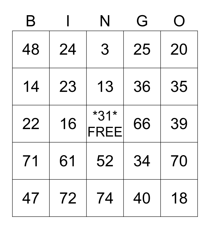 This bingo card has a free space and 75 words: 1, 2, 3, 4, 5, 6, 7, 8, 9, 10, 11, 12, 13, 14, 15, 16, 17, 18, 19, 20, 21, 22, 23, 24, 25, 26, 27, 28, 29, 30, 31, 32, 33, 34, 35, 36, 37, 38, 39, 40, 41, 42, 43, 44, 45, 46, 47, 48, 49, 50, 51, 52, 53, 54, 55, 56, 57, 58, 59, 60, 61, 62, 63, 64, 65, 66, 67, 68, 69, 70, 71, 72, 73, 74 and 75.
