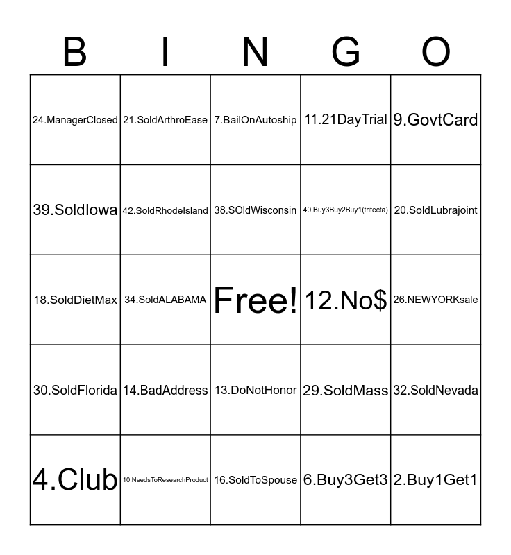 This bingo card has a free space and 43 words: 1.FullBoat, 2.Buy1Get1, 3.DvD, 4.Club, 5.Buy2Get2, 6.Buy3Get3, 7.BailOnAutoship, 8.5332Card, 9.GovtCard, 10.NeedsToResearchProduct, 11.21DayTrial, 12.No$, 13.DoNotHonor, 14.BadAddress, 15.PitchedLikeaBOSS, 16.SoldToSpouse, 17.SoldWrongNumber, 18.SoldDietMax, 19.SoldMedDiet, 20.SoldLubrajoint, 21.SoldArthroEase, 22.SoldMaleEnhancement, 23.2salesInAnHour, 24.ManagerClosed, 25.RebuttedtwicetoCLOSE, 26.NEWYORKsale, 27.CaliforniaSale, 28.SoldNEWENGLANDSTATE, 29.SoldMass, 30.SoldFlorida, 31.SoldTEXAS, 32.SoldNevada, 33.SOLDVirginia, 34.SoldALABAMA, 35.SOLDGeorgia, 36.SoldOregon, 37.SoldArkansas, 38.SOldWisconsin, 39.SoldIowa, 40.Buy3Buy2Buy1(trifecta), 41.NoneEnglishSALE, 42.SoldRhodeIsland and 43.SoldColorado.