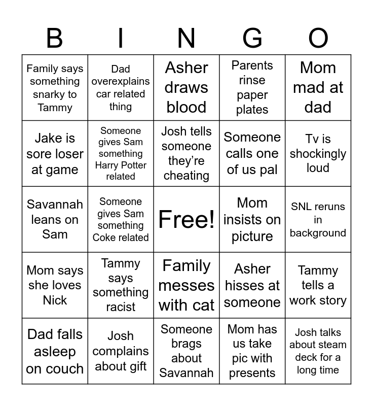This bingo card has a free space and 24 words: Tammy says something racist, Josh complains about gift, Josh tells someone they’re cheating, Dad falls asleep on couch, Mom mad at dad, Family says something snarky to Tammy, Jake is sore loser at game, Dad overexplains car related thing, Mom insists on picture, Family messes with cat, Someone calls one of us pal, Savannah leans on Sam, Asher hisses at someone, Tammy tells a work story, Someone gives Sam something Harry Potter related, Mom has us take pic with presents, SNL reruns in background, Asher draws blood, Tv is shockingly loud, Someone gives Sam something Coke related, Josh talks about steam deck for a long time, Mom says she loves Nick, Parents rinse paper plates and Someone brags about Savannah.