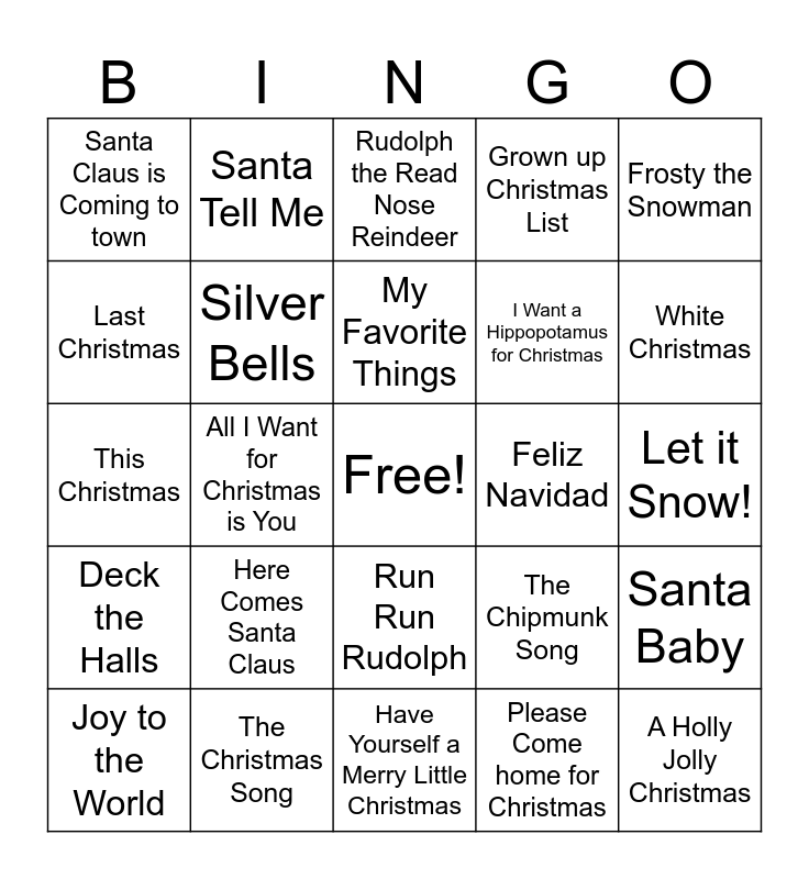 This bingo card has a free space and 29 words: Joy to the World, Rockin' Around the Christmas Tree, All I Want for Christmas is You, Jingle Bell Rock, Santa Claus is Coming to town, Rudolph the Read Nose Reindeer, Silver Bells, Here Comes Santa Claus, Feliz Navidad, The Christmas Song, Let it Snow!, A Holly Jolly Christmas, Have Yourself a Merry Little Christmas, Please Come home for Christmas, White Christmas, Blue Christmas, Run Run Rudolph, Deck the Halls, Frosty the Snowman, This Christmas, The Chipmunk Song, You're a mean one, Mr. Grinch, I Want a Hippopotamus for Christmas, Last Christmas, Grown up Christmas List, Santa Tell Me, Santa Baby, My Favorite Things and Merry Christmas, Happy Holidays.