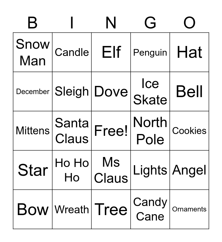 This bingo card has a free space and 30 words: Wreath, Reindeer, Santa Claus, Stocking, Snow Man, Elf, Sleigh, Ms Claus, North Pole, Tree, Cookies, Ornaments, Candy Cane, Gift, Bell, Snow Flakes, Lights, Star, Ho Ho Ho, Hat, Mittens, Ginger Bread House, Candle, Ice Skate, December, Penguin, Angel, Bow, Dove and Toy Soldier.