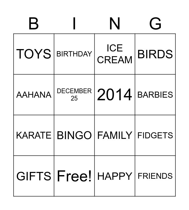 This bingo card has 22 words: Free!, ZEEYA, BIRTHDAY, CHRISTMAS, DECEMBER 25, 2014, TOYS, ICE CREAM, FAMILY, FRIENDS, KARATE, BIRDS, STRONG, HOLIDAYS, HAPPY, FUN, FIDGETS, GIFTS, BINGO, AAHANA, BARBIES and SNOW.