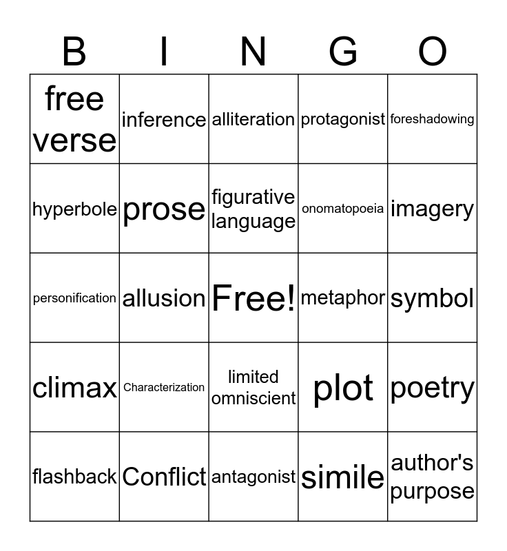 This bingo card has a free space and 24 words: Characterization, Conflict, figurative language, flashback, foreshadowing, free verse, hyperbole, inference, metaphor, limited omniscient, onomatopoeia, personification, plot, poetry, prose, simile, symbol, alliteration, imagery, allusion, author's purpose, climax, protagonist and antagonist.