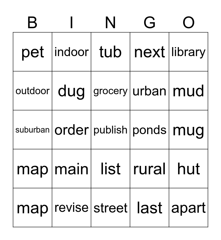 This bingo card has 25 words: main, street, grocery, map, library, pet, outdoor, indoor, ponds, list, urban, suburban, rural, hut, dug, apart, mug, tub, mud, order, publish, revise, map, next and last.