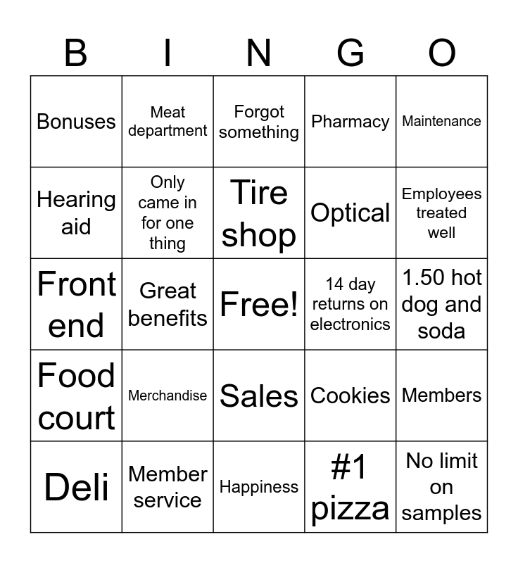 This bingo card has a free space and 31 words: Happiness, Wonderful employees, Great benefits, Happy members, Bonuses, Forgot something, Only came in for one thing, Cookies, 14 day returns on electronics, #1 pizza, 1.50 hot dog and soda, No limit on samples, Don't forget gas, Cheapest liquor store, Employees treated well, Offer free tech support, Members, Merchandise, Food court, Sales, Maintenance, Bakery, Deli, Meat department, Optical, Hearing aid, Pharmacy, Front end, Member service, Tire shop and Bulk.
