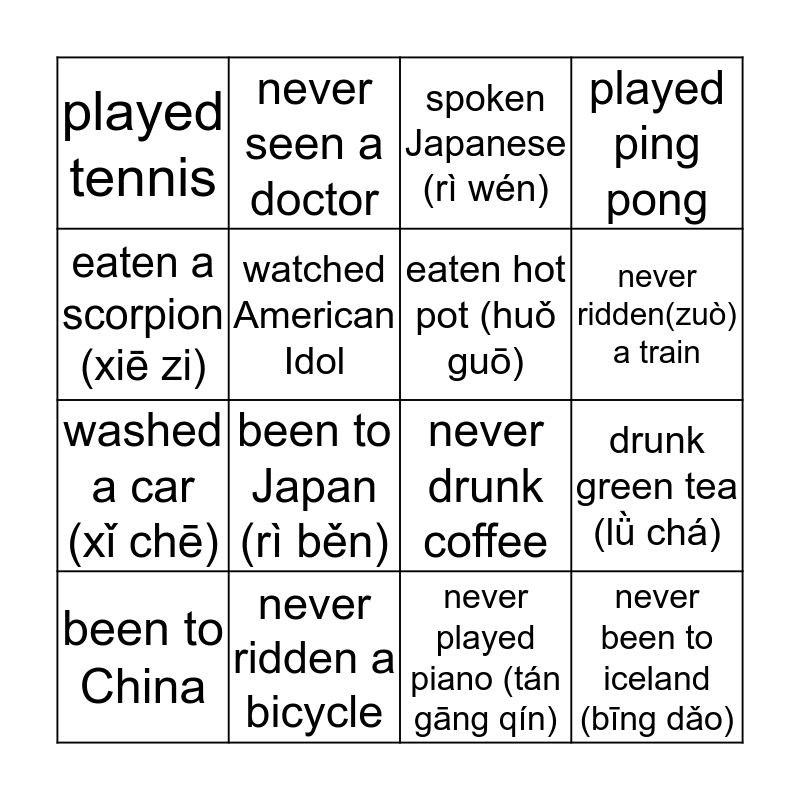 This bingo card has a free space and 15 words: been to China, never been to iceland (bīng dǎo), spoken Japanese (rì wén), played tennis, never ridden(zuò) a train, eaten a scorpion (xiē zi), been to Japan (rì běn), never played piano (tán gāng qín), watched American Idol, washed a car (xǐ chē), drunk green tea (lǜ chá), played ping pong, eaten hot pot (huǒ guō), never seen a doctor and never ridden a bicycle.