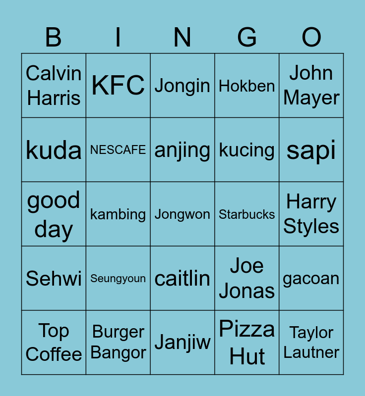 This bingo card has a free space and 24 words: Seungyoun, Burger Bangor, anjing, Top Coffee, John Mayer, Calvin Harris, kuda, KFC, Starbucks, caitlin, kucing, good day, Joe Jonas, gacoan, NESCAFE, Pizza Hut, Harry Styles, Jongin, sapi, kambing, Taylor Lautner, Sehwi, Hokben and Janjiw.