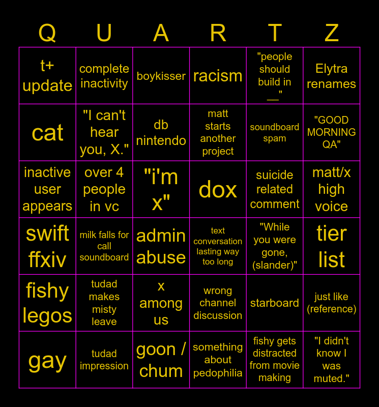 This bingo card has 39 words: tudad impression, gay, piracy, cat, admin abuse, matt/x high voice, "I can't hear you, X.", "I didn't know I was muted.", "people should build in __", dox, "GOOD MORNING QA", racism, inactive user appears, "i'm x", over 4 people in vc, suicide related comment, starboard, t+ update, goon / chum, swift ffxiv, Elytra renames, "While you were gone, (slander)", db nintendo, matt starts another project, something about pedophilia, x among us, fishy legos, fishy gets distracted from movie making, tudad makes misty leave, complete inactivity, picrew, just like (reference), boykisser, text conversation lasting way too long, tier list, wrong channel discussion, milk falls for call soundboard, soundboard spam and food argument.