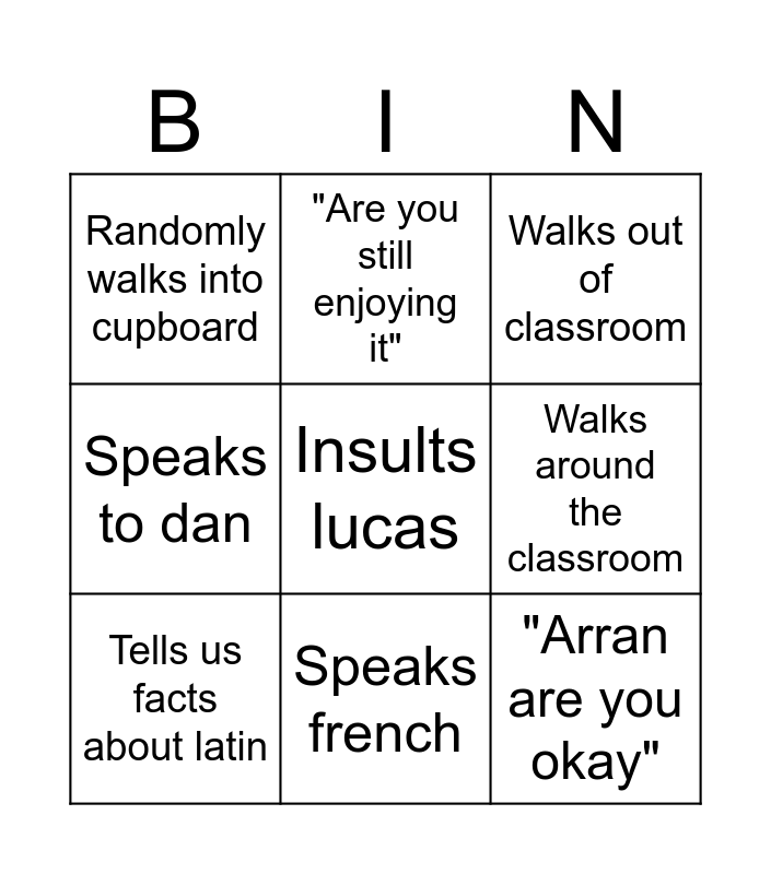 This bingo card has 21 words: "We cant spend all day...", "Back in my day...", "Are you still enjoying it", "Put your pens down please", Asks olivier to say something in polish, Tells us facts about latin, Randomly walks into cupboard, Walks out of classroom, "Can we just watch for a minute", Speaks french, "Arran are you okay", Speaks to dan, Speaks to tom, Speaks to olivier, Walks around the classroom, "Matthew are you okay", "We need to move on", "Teaching you lot is the highlight of my day", Insults lucas, Awkward silence and Asks a question and answers it himself.