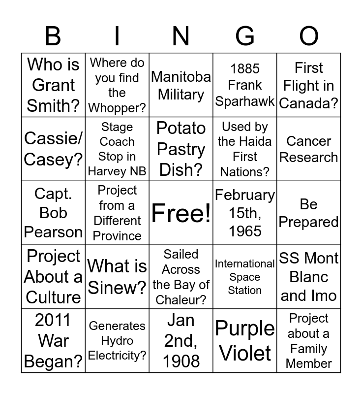 This bingo card has a free space and 24 words: What is Sinew?, Generates Hydro Electricity?, Potato Pastry Dish?, 2011 War Began?, First Flight in Canada?, Who is Grant Smith?, Cassie/ Casey?, Where do you find the Whopper?, February 15th, 1965, Sailed Across the Bay of Chaleur?, Used by the Haida First Nations?, Capt. Bob Pearson, International Space Station, SS Mont Blanc and Imo, Stage Coach Stop in Harvey NB, Purple Violet, Be Prepared, Manitoba Military, Cancer Research, Project from a Different Province, Project about a Family Member, Project About a Culture, 1885 Frank Sparhawk and Jan 2nd, 1908.
