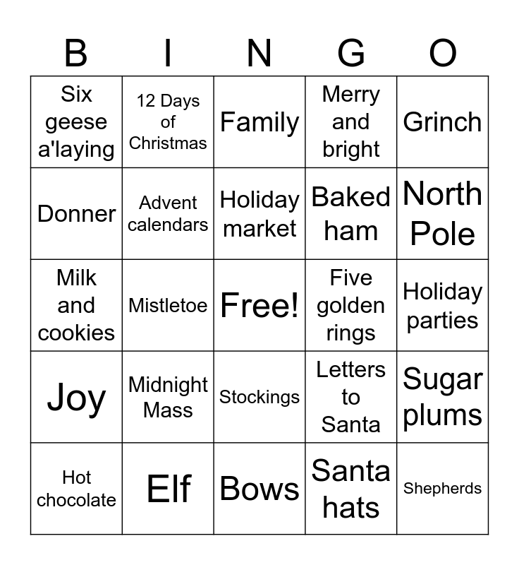 This bingo card has a free space and 92 words: Christmas tree, Presents, Bows, Wrapping paper, Snow, Sleigh rides, Reindeer, Hot chocolate, Sledding, Twinkling lights, Ornaments, Snowmen, Angel, Baked ham, Turkey, Grinch, Family, Ice skating, Mittens, Pajamas, Ugly sweaters, Mariah Carey, Traditions, Candles, Midnight Mass, Advent calendars, Nativity scene, Santa Claus, Mrs. Claus, Decorating cookies, Elf, Stockings, Fireplace, Coal, 12 Days of Christmas, Scrooge, Caroling, Wreath, Holiday market, Letters to Santa, Milk and cookies, Joy, Holiday parties, Eggnog, Shepherds, Christmas pageant, Season of giving, Candy cane, Tinsel, Manger, Garland, Rudolph, Prancer, Dancer, Vixen, Comet, Cupid, Donner, Blitzen, Mistletoe, Nutcracker, Deck the Halls, Noel, Jingle Bells, Christmas cards, Santa hats, Frosty, Holly, Panic shopping, Ribbon, Myrrh, Frankincense, Merry and bright, Three wise men, Bethlehem, Gingerbread houses, Sugar plums, Partridge in a pear tree, Two turtle doves, Three French hens, Four calling birds, Five golden rings, Six geese a'laying, Seven swans a'swimming, Eight maids a'milking, Nine Ladies dancing, Ten Lords a'leaping, Eleven pipers piping, Twelve drummers drumming, Snowball fight, North Pole and Poinsettia.