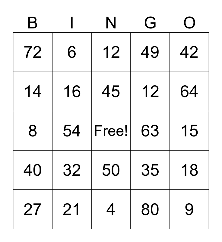 This bingo card has a free space and 36 words: 28, 24, 20, 16, 35, 40, 45, 36, 42, 48, 54, 49, 56, 63, 64, 72, 81, 32, 9, 12, 15, 18, 21, 27, 4, 6, 8, 10, 12, 14, 60, 70, 80, 50, 90 and 100.