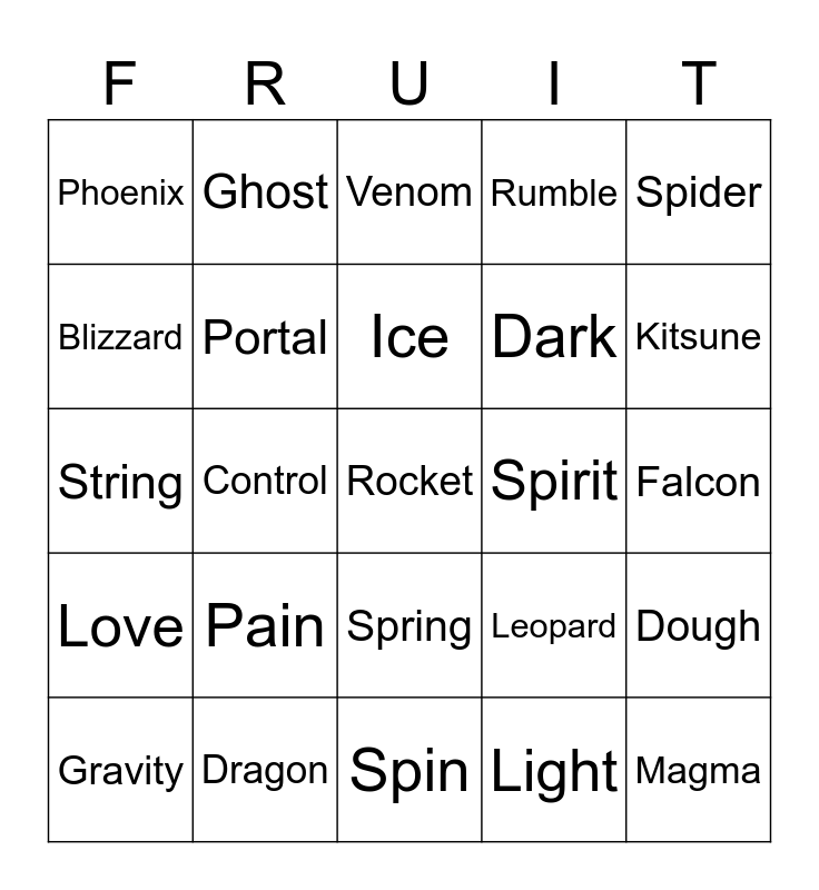 This bingo card has a free space and 24 words: Gravity, Pain, Ice, Light, Spider, Phoenix, Ghost, Venom, Spirit, Falcon, String, Portal, Leopard, Dough, Blizzard, Dragon, Spin, Rumble, Kitsune, Love, Control, Spring, Dark and Magma.