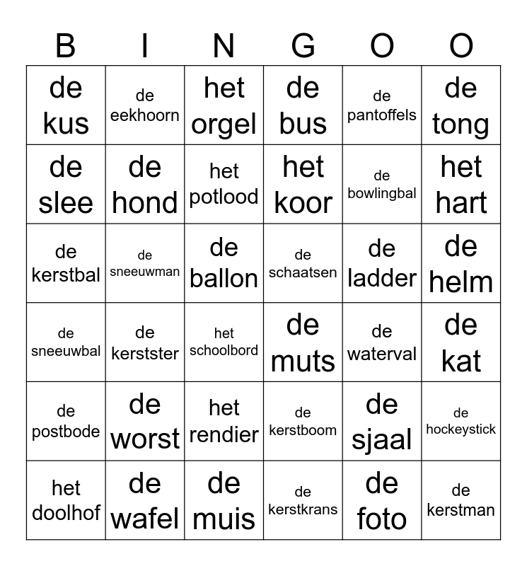This bingo card has 36 words: de kerstboom, het rendier, de kerstkrans, de slee, de sneeuwbal, de schaatsen, de hond, de muis, de pantoffels, de sjaal, het hart, de bus, de hockeystick, de sneeuwman, het koor, de kus, de postbode, de ladder, de kerstbal, het orgel, de ballon, de kerstster, de muts, het schoolbord, de waterval, de eekhoorn, de bowlingbal, de wafel, het potlood, de tong, de kerstman, het doolhof, de kat, de helm, de worst and de foto.