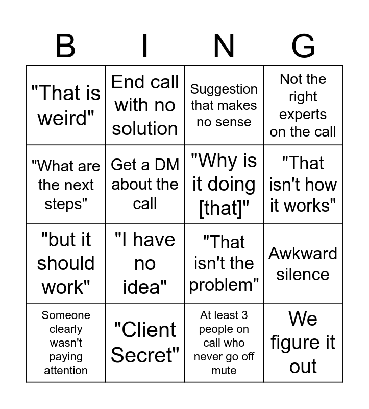 This bingo card has 16 words: "Client Secret", Awkward silence, Suggestion that makes no sense, "That is weird", "but it should work", End call with no solution, "That isn't the problem", At least 3 people on call who never go off mute, "What are the next steps", Get a DM about the call, Someone clearly wasn't paying attention, Not the right experts on the call, "I have no idea", "That isn't how it works", "Why is it doing [that]" and We figure it out.