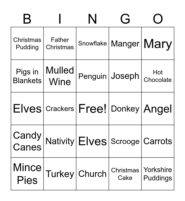 This bingo card has a free space and 26 words: Elves, Christmas Cake, Penguin, Turkey, Mary, Christmas Pudding, Pigs in Blankets, Father Christmas, Angel, Scrooge, Joseph, Elves, Carrots, Mince Pies, Crackers, Carrots, Manger, Candy Canes, Snowflake, Yorkshire Puddings, Hot Chocolate, Church, Donkey, Nativity, Mulled Wine and Penguin.