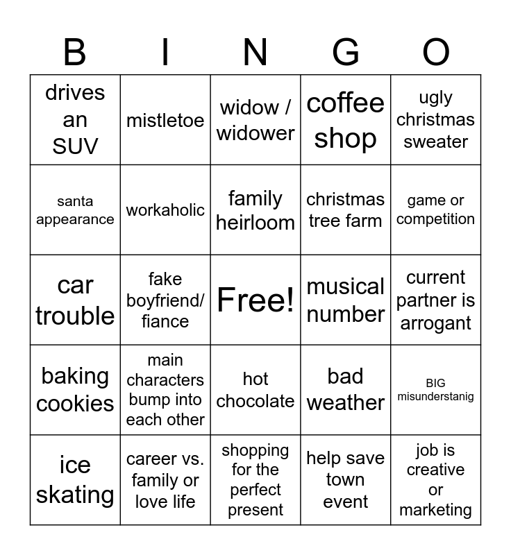 This bingo card has a free space and 29 words: ice skating, main character falls down, fake boyfriend/ fiance, town christmas festival, drives an SUV, widow / widower, workaholic, main characters bump into each other, musical number, career vs. family or love life, current partner is arrogant, job is creative or marketing, shopping for the perfect present, help save town event, game or competition, throwing snowballs, hot chocolate, baking cookies, ugly christmas sweater, car trouble, bad weather, christmas wish, christmas tree farm, santa appearance, coffee shop, mistletoe, BIG misunderstanig, family heirloom and carriage ride.