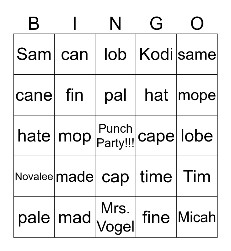 This bingo card has a free space and 24 words: made, mad, pal, pale, same, Sam, cane, can, cape, cap, hat, hate, time, Tim, fin, fine, lobe, lob, mope, mop, Micah, Novalee, Kodi and Mrs. Vogel.