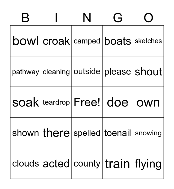 This bingo card has a free space and 29 words: clouds, try, teardrop, Mick, bowl, camped, cleaning, there, doe, acted, own, flying, county, train, shout, donkey, spelled, shown, sketches, soak, toenail, strength, please, pathway, boats, croak, snowing, outside and couch.
