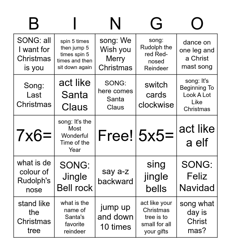 This bingo card has a free space and 25 words: SONG: Jingle Bell rock, jump up and down 10 times, SONG: here comes Santa Claus, stand like the Christmas tree, dance on one leg and a Christ mast song, SONG: all I want for Christmas is you, Song: Last Christmas, spin 5 times then jump 5 times spin 5 times and then sit down again, 5x5=, say a-z backward, switch cards clockwise, 7x6=, sing jingle bells, SONG: Feliz Navidad, act like Santa Claus, act like grinch, act like a elf, song: We Wish you Merry Christmas, song: It's Beginning To Look A Lot Like Christmas, song: It's the Most Wonderful Time of the Year, song what day is Christ mas?, what is the name of Santa's favorite reindeer, what is de colour of Rudolph's nose, song: Rudolph the red Red-nosed Reindeer and act like your Christmas tree is to small for all your gifts.