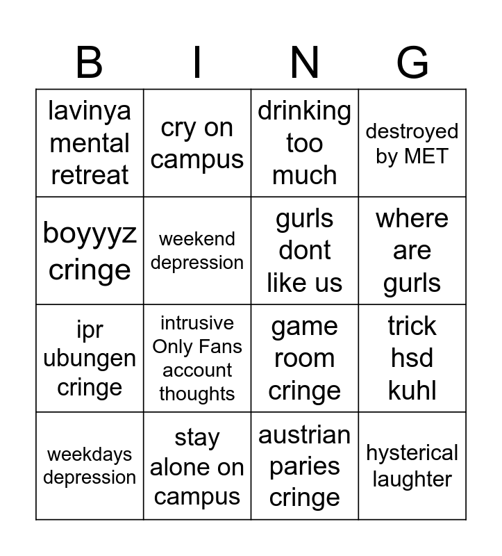 This bingo card has 16 words: stay alone on campus, trick hsd kuhl, drinking too much, lavinya mental retreat, ipr ubungen cringe, cry on campus, game room cringe, austrian paries cringe, boyyyz cringe, weekend depression, weekdays depression, destroyed by MET, intrusive Only Fans account thoughts, where are gurls, gurls dont like us and hysterical laughter.