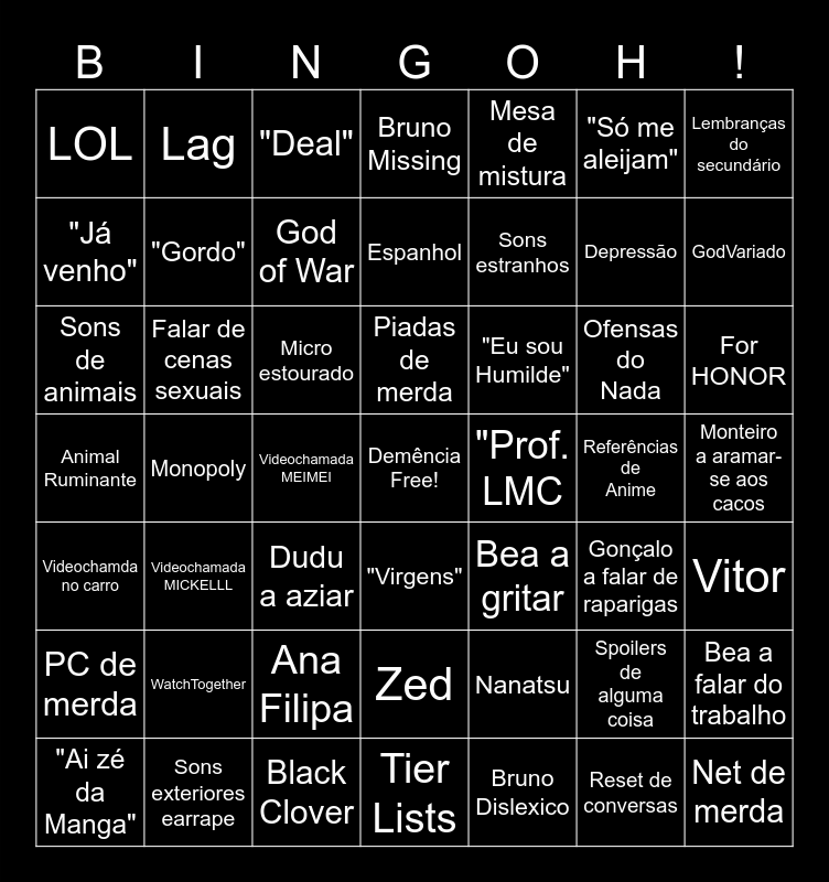This bingo card has a free space and 55 words: Bruno Dislexico, For HONOR, Silêncio Cringe, LOL, Monopoly, WatchTogether, Lembranças do secundário, Curvelex, "Gordo", Ana Filipa, Bruno Missing, Vitor, Monteiro a aramar-se aos cacos, Referências de Anime, "Ai zé da Manga", Videochamda no carro, Mesa de mistura, Sons estranhos, Reset de conversas, Depressão, GodVariado, Videochamada MICKELLL, "Eu sou Humilde", "Deal", Cabeça tá na estrada, "Já venho", Videochamada MEIMEI, McDonalds, Sons de animais, Ofensas do Nada, "Sem vida", Gonçalo a falar de raparigas, Bea a falar do trabalho, Sons exteriores earrape, "Só me aleijam", Espanhol, PC de merda, Falar de cenas sexuais, Net de merda, Dudu a aziar, Lag, Zed, Nanatsu, Videos do grupo, Micro estourado, Animal Ruminante, Black Clover, Bea a gritar, "Prof. LMC, God of War, "Virgens", Spoilers de alguma coisa, Tier Lists, Piadas de merda and L Gonçalo.