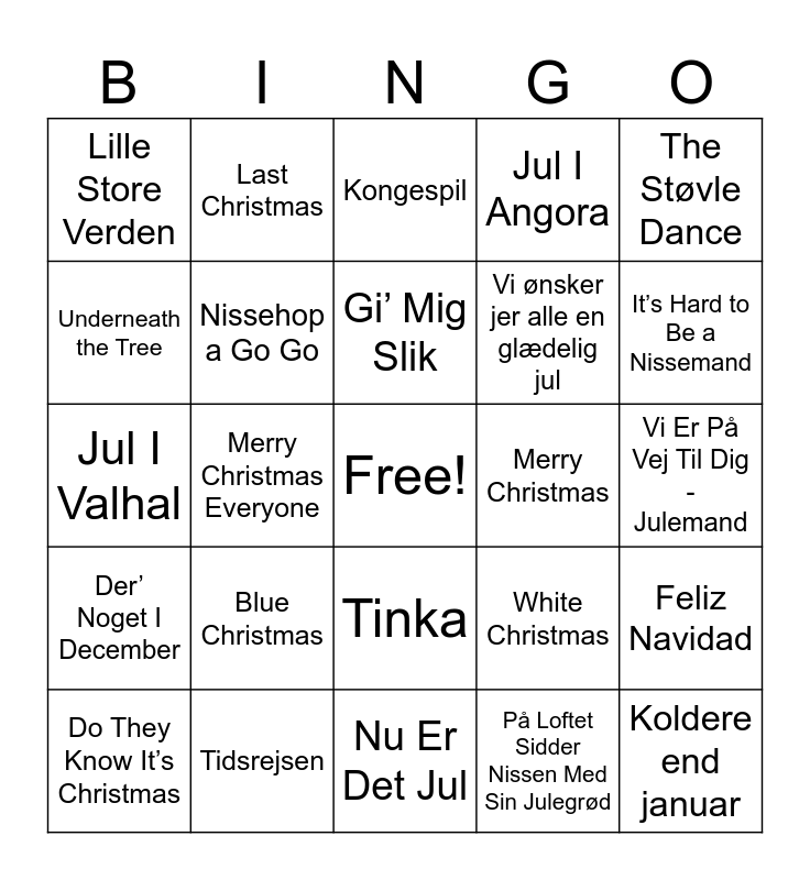This bingo card has 72 words: All I Want For Christmas Is You, Last Christmas, Tinka, Santa Tell Me, It’s Beginning To Look a Lot Like Christmas, I En Stjerneregn Af Sne, Merry Christmas Everyone, Julehjertets Hemmelighed, Merry Christmas, Driving Home for Christmas, Do They Know It’s Christmas, Mistletoe, Free!, Jul I Angora, Jesus & Josefine, Lille Store Verden, God Jul (Kometernes Jul), Kongespil, Julefeber, The Støvle Dance, Jul I Valhal, Tidsrejsen, Nu Er Det Jul, Mary’s Boy Child, Koldere end januar, Søren Banjomus, Lille Messias, Rockin’ Aroundt the Christmas Tree, Wonderful Christmastime, Endelig Jul Igen, Let Love Be Love, Hey Mor, Guld Jul, Jul det’ cool, It’s Hard to Be a Nissemand, Den Himmelblå, Gnags’ Julesang, Merry Xmas Everybody, Vi ønsker jer alle en glædelig jul, Feliz Navidad, Der’ Noget I December, Stjernestøv, It’s Gonna Be a Cold, Cold Christmas, Jul På Vesterbro, My Only Wish (This Year), Underneath the Tree, Jul På Vimmersvej, Happy Xmas (War Is Over), Thank God Its’s Christmas, Christmas Lights, Mistletoe and Wine, Have Yourself a Merry Little Christmas, Rap Jul, White Christmas, Vi Er På Vej Til Dig - Julemand, Cool Jul, Nissehop a Go Go, Gi’ Mig Slik, Vil Du Være Min I Nat, Risengrød, Til Julebal I Nisseland, Onkel Rejes Julefis, Hjerternes Fest, På Loftet Sidder Nissen Med Sin Julegrød, Kender I den Om Rudolf, Jeg så julemanden kysse mor, Blue Christmas, Jingle Bells, Santa Claus Is coming to Town, Let It Snow!, Let It Go and Christmas Is All Around.
