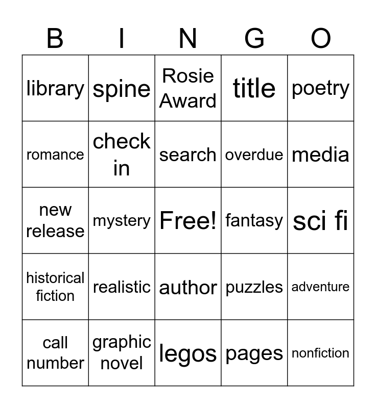 This bingo card has a free space and 41 words: Destiny, new release, publication date, check in, graphic novel, author, search, fiction, poetry, historical fiction, mystery, title, nonfiction, sci fi, fantasy, realistic, sports, library, genre, Rosie Award, adventure, research, legos, overdue, book, biography, pages, checkout, media, makerspace, Dewey Decimal, spine, call number, catalog, puzzles, romance, shelf, read, genealogy, ebook and subject heading.
