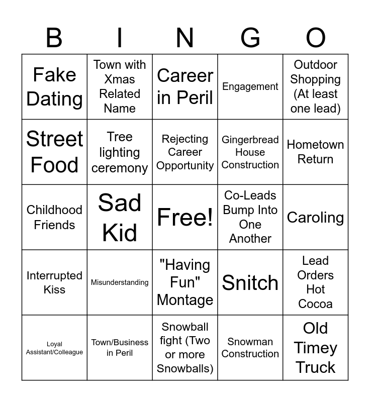 This bingo card has a free space and 35 words: Loved One Heart to Heart, Transportation Issues, Family Member Passed Away, Tree lighting ceremony, "Having Fun" Montage, Engagement, Street Food, Missing Family Member, Rejecting Career Opportunity, Grumpy Person, Childhood Friends, Outdoor Shopping (At least one lead), Holiday Related Contest, Tree decorating, Fake Dating, Co-Leads Bump Into One Another, Snowman Construction, Sad Kid, Interrupted Kiss, Old Timey Truck, Snitch, Loyal Assistant/Colleague, Lead Orders Hot Cocoa, Town/Business in Peril, Career in Peril, Hometown Return, Ex-BF/GF/ Husband/Wive, Decorating Christmas Cookies, Gingerbread House Construction, Caroling, 3+ Coats, Snowball fight (Two or more Snowballs), Misunderstanding, Town with Xmas Related Name and Date @ Night.