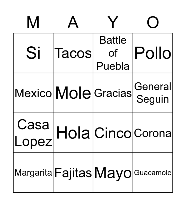 This bingo card has a free space and 15 words: Margarita, Guacamole, Battle of Puebla, Si, General Seguin, Mexico, Hola, Mayo, Mole, Casa Lopez, Corona, Pollo, Gracias, Tacos and Fajitas.