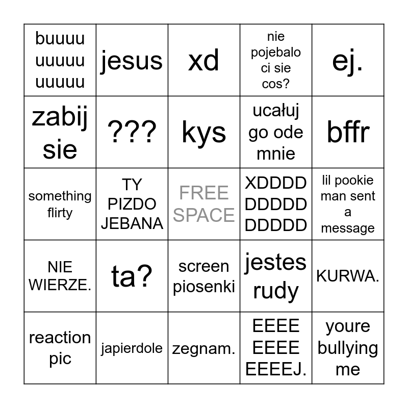 This bingo card has a free space and 24 words: ta?, japierdole, kys, reaction pic, ej., buuuu uuuuu uuuuu, zabij sie, jesus, XDDDD DDDDD DDDDD, screen piosenki, ucałuj go ode mnie, something flirty, jestes rudy, KURWA., ???, EEEE EEEE EEEEJ., lil pookie man sent a message, xd, bffr, TY PIZDO JEBANA, youre bullying me, NIE WIERZE., nie pojebalo ci sie cos? and zegnam..