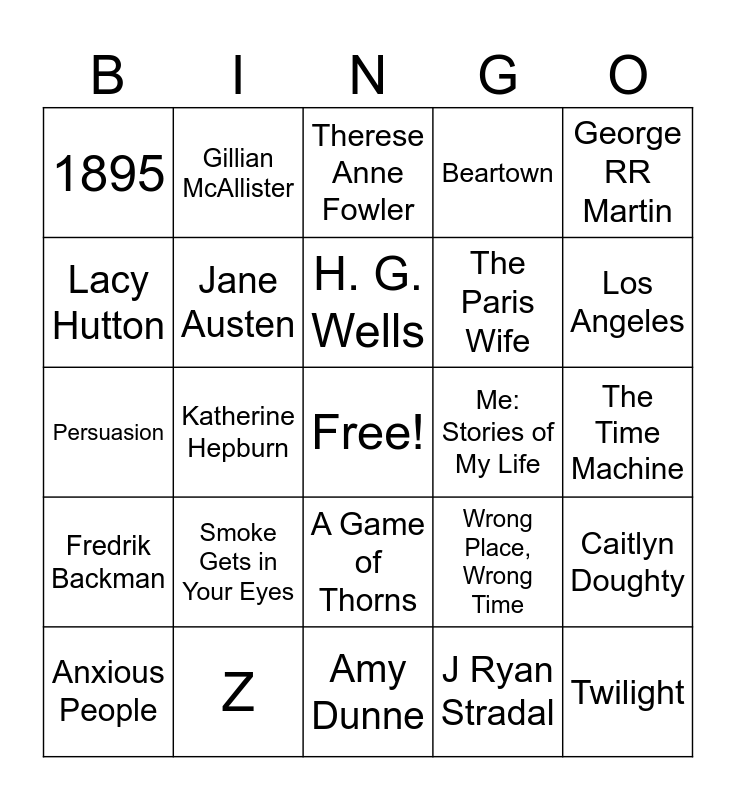 This bingo card has a free space and 32 words: J Ryan Stradal, Sally Thorne, Katherine Hepburn, Gillian Flynn, Fredrik Backman, Jane Austen, George RR Martin, Caitlyn Doughty, Gillian McAllister, Stephanie Meyer, H. G. Wells, Therese Anne Fowler, The Hating Game, Lager Queen of Minnesota, Me: Stories of My Life, Gone Girl, Anxious People, Persuasion, A Game of Thorns, Smoke Gets in Your Eyes, Wrong Place, Wrong Time, The Chemist, The Time Machine, Z, Twilight, Beartown, The Paris Wife, Lacy Hutton, 1895, Amy Dunne, Spencer Tracy and Los Angeles.