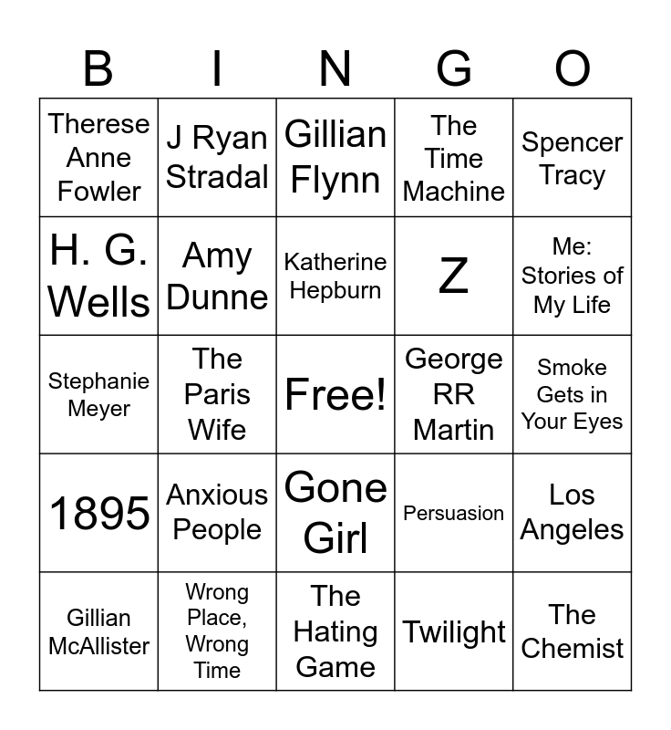This bingo card has a free space and 32 words: Twilight, Beartown, The Paris Wife, Lacy Hutton, 1895, Amy Dunne, Spencer Tracy, Los Angeles, J Ryan Stradal, Sally Thorne, Katherine Hepburn, Gillian Flynn, Fredrik Backman, Jane Austen, George RR Martin, Caitlyn Doughty, Gillian McAllister, Stephanie Meyer, Gone Girl, Anxious People, Persuasion, A Game of Thorns, Smoke Gets in Your Eyes, Wrong Place, Wrong Time, The Chemist, The Time Machine, Z, H. G. Wells, Therese Anne Fowler, The Hating Game, Lager Queen of Minnesota and Me: Stories of My Life.