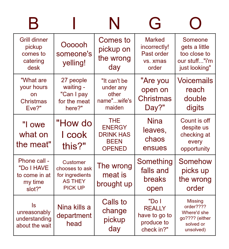 This bingo card has a free space and 34 words: Husband comes to pick up & doesn't know what wife ordered, "Do I REALLY have to go to produce to check in?", Is unreasonably impatient about the wait, 8am - "I'm here to pick up", Phone call - "Do I HAVE to come in at my time slot?", 27 people waiting - "Can I pay for the meat here?", Someone gets a little too close to our stuff..."i'm just looking", Is unreasonably understanding about the wait, Oooooh someone's yelling!, Dad joke, "It can't be under any other name"...wife's maiden, Comes to pickup on the wrong day, Customer leaves part of their order in the store/parking lot, Deliberately comes around the table despite us telling them not to, Nina leaves, chaos ensues, Voicemails reach double digits, Nina kills a department head, "I owe what on the meat", Customer chooses to ask for ingredients AS THEY PICK UP, Something falls and breaks open, The wrong meat is brought up, Calls back for heating instructions, Grill dinner pickup comes to catering desk, Count is off despite us checking at every opportunity, Calls to change pickup day, Missing order???? Where'd she go???? (either solved or unsolved), Marked incorrectly! Past order vs. xmas order, "That looks delicious" - not a catering customer, "Are you open on Christmas Day?", "What are your hours on Christmas Eve?", "Do you guys sell any turkeys?", "How do I cook this?", Somehow picks up the wrong order and One of us: "I need a drink".