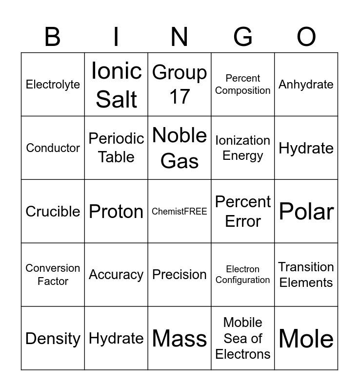 This bingo card has a free space and 45 words: Ion, Mole, Kilo, Density, Atomic Number, Mobile Sea of Electrons, Group 17, Mendeleev, Anhydrate, Hydrate, Percent Composition, Percent Error, Precision, Accuracy, GFM, Mass, Volume, Crucible, Bunsen Burner, Hydrate, Ionic Salt, Mole Ratio, Group 1, Electrolyte, Group 2, Polar, Nonpolar, Solubility, Electron Configuration, Conversion Factor, Scientific Notation, Transition Elements, Boiling Point, Dot Diagram, Valence Electrons, Proton, Electron, Electronegativity, Period, Noble Gas, Conductor, Ionization Energy, Cation, Periodic Table and Anion.
