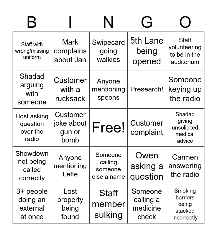 This bingo card has a free space and 27 words: Owen asking a question, Mark getting paranoid, Presearch!, Staff member sulking, Shadad arguing with someone, Swipecard going walkies, Mark complains about Jan, Showdown not being called correctly, Customer complaint, Carmen answering the radio, Host asking question over the radio, 5th Lane being opened, 3+ people doing an external at once, Lost property being found, Someone keying up the radio, Intoxicated customer, Customer with a rucksack, Anyone mentioning spoons, Anyone mentioning Leffe, Staff with wrong/missing uniform, Shadad giving unsolicited medical advice, Someone calling a medicine check, Customer joke about gun or bomb, Smoking barriers being stacked incorrectly, Someone calling someone else a name, Staff volunteering to be in the auditorium and Customer complaining about the search procedure.