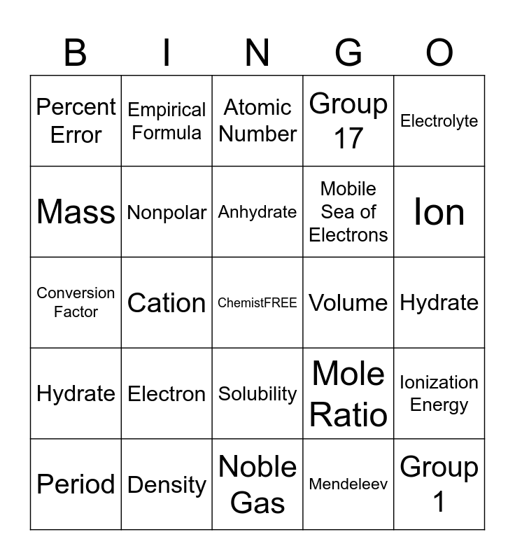 This bingo card has a free space and 50 words: Precision, Group 1, Periodic Table, Noble Gas, Electron, Boiling Point, Empirical Formula, Valence Electrons, Mass, GFM (Gram Formula Mass), Nonpolar, Group 17, Ionization Energy, Mole Ratio, Transition Elements, Mole, Anhydrate, Volume, Ionic Salt, Electrolyte, Cation, Mendeleev, Percent Error, Mobile Sea of Electrons, Dot Diagram, Bunsen Burner, Ion, Hydrate, Atomic Number, Solubility, Polar, Proton, Percent Composition, Period, Density, Precision, Accuracy, Scientific Notation, Crucible, Hydrate, Valence Electrons, Electron Configuration, Noble Gas, Conductor, Period, Conversion Factor, Anion, Group 2, Hydrate and Bunsen Burner.