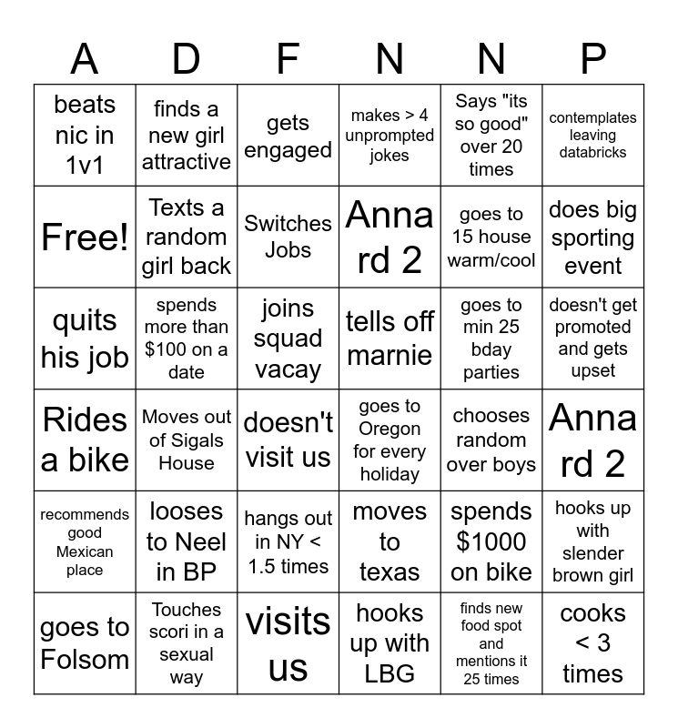 This bingo card has 36 words: Rides a bike, Moves out of Sigals House, visits us, Anna rd 2, goes to min 25 bday parties, doesn't get promoted and gets upset, beats nic in 1v1, Touches scori in a sexual way, gets engaged, moves to texas, goes to 15 house warm/cool, contemplates leaving databricks, recommends good Mexican place, spends more than $100 on a date, Switches Jobs, makes > 4 unprompted jokes, spends $1000 on bike, Anna rd 2, Free!, Texts a random girl back, doesn't visit us, goes to Oregon for every holiday, chooses random over boys, hooks up with slender brown girl, quits his job, finds a new girl attractive, joins squad vacay, hooks up with LBG, Says "its so good" over 20 times, does big sporting event, goes to Folsom, looses to Neel in BP, hangs out in NY < 1.5 times, tells off marnie, finds new food spot and mentions it 25 times and cooks < 3 times.