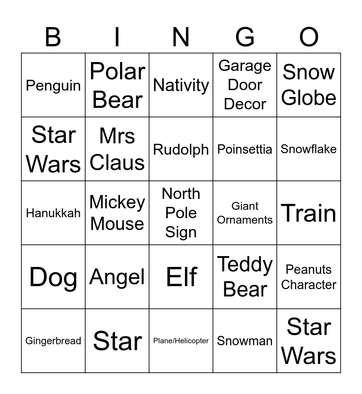 This bingo card has 34 words: Star Wars, Snowman, Candy Cane Path, Wreath, Dog, Mrs Claus, Snow Globe, Gingerbread, Polar Bear, Cactus, Rudolph, Nativity, Grinch, Big Presents, Giant Ornaments, Snowflake, Star, Hanukkah, Angel, Teddy Bear, Elf, Nutcracker, Penguin, Train, Plane/Helicopter, North Pole Sign, Garage Door Decor, Candles, Poinsettia, Star Wars, Super Hero, Mickey Mouse, Peanuts Character and Santa on Roof.