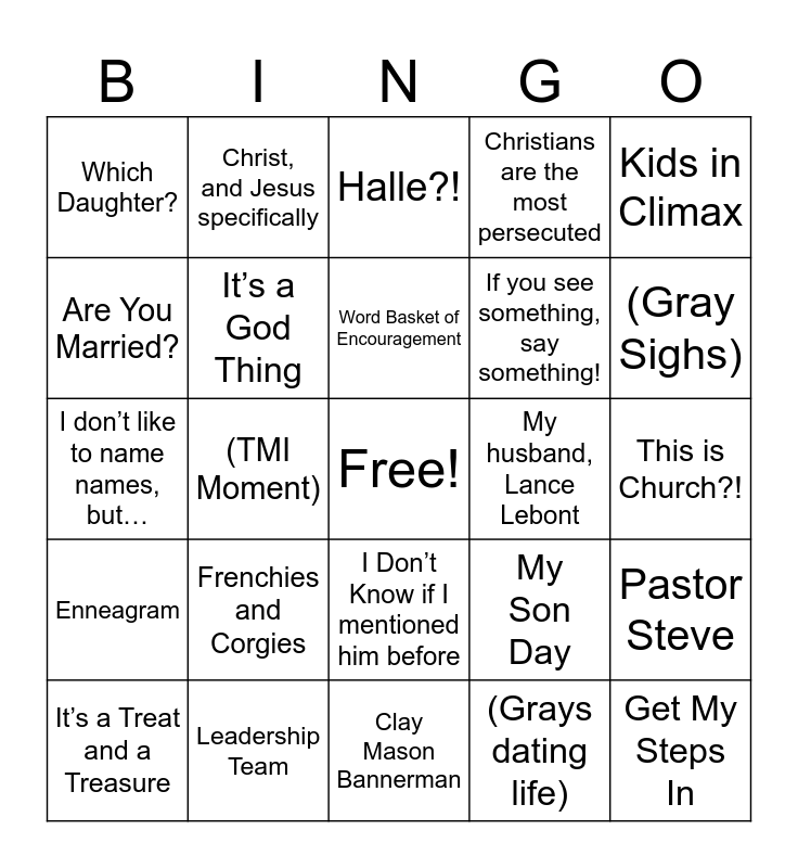 This bingo card has a free space and 25 words: Frenchies and Corgies, Clay Mason Bannerman, Word Basket of Encouragement, It’s a Treat and a Treasure, Kids in Climax, Which Daughter?, Are You Married?, Christ, and Jesus specifically, My husband, Lance Lebont, I Don’t Know if I mentioned him before, If you see something, say something!, I don’t like to name names, but…, My Son Day, Pastor Steve, It’s a God Thing, Covered in the Blood, This is Church?!, Halle?!, (Gray Sighs), (TMI Moment), Get My Steps In, Leadership Team, Enneagram, Christians are the most persecuted and (Grays dating life).