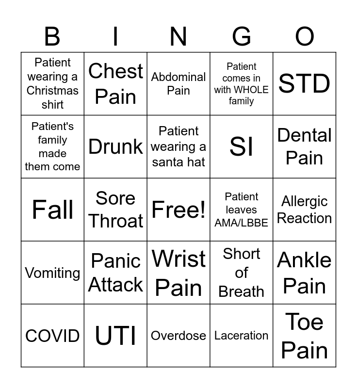 This bingo card has a free space and 26 words: Wrist Pain, Laceration, Patient wearing a santa hat, UTI, STD, Patient wearing a Christmas shirt, Patient's family made them come, Chest Pain, Allergic Reaction, Short of Breath, SI, Fall, Ankle Pain, COVID, Sore Throat, Cough, Patient comes in with WHOLE family, Vomiting, Abdominal Pain, Toe Pain, Dental Pain, Overdose, Patient leaves AMA/LBBE, Panic Attack, Drunk and MVC.