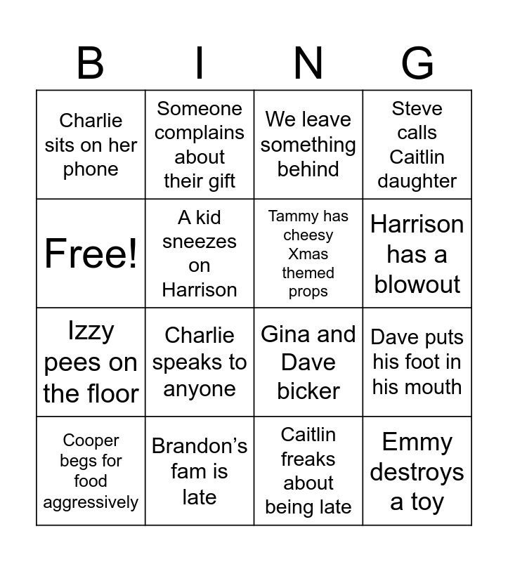 This bingo card has 16 words: Brandon’s fam is late, Dave puts his foot in his mouth, We leave something behind, Charlie sits on her phone, Izzy pees on the floor, Someone complains about their gift, Gina and Dave bicker, Caitlin freaks about being late, Free!, A kid sneezes on Harrison, Cooper begs for food aggressively, Steve calls Caitlin daughter, Charlie speaks to anyone, Harrison has a blowout, Tammy has cheesy Xmas themed props and Emmy destroys a toy.