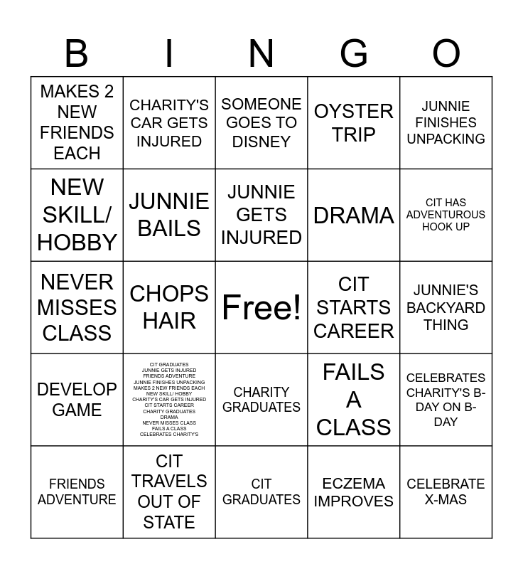 This bingo card has a free space and 25 words: CIT GRADUATES JUNNIE GETS INJURED FRIENDS ADVENTURE JUNNIE FINISHES UNPACKING MAKES 2 NEW FRIENDS EACH NEW SKILL/ HOBBY CHARITY'S CAR GETS INJURED CIT STARTS CAREER CHARITY GRADUATES DRAMA NEVER MISSES CLASS FAILS A CLASS CELEBRATES CHARITY'S, CIT GRADUATES, JUNNIE GETS INJURED, FRIENDS ADVENTURE, JUNNIE FINISHES UNPACKING, MAKES 2 NEW FRIENDS EACH, NEW SKILL/ HOBBY, CHARITY'S CAR GETS INJURED, CIT STARTS CAREER, CHARITY GRADUATES, DRAMA, NEVER MISSES CLASS, FAILS A CLASS, CELEBRATES CHARITY'S B-DAY ON B-DAY, JUNNIE BAILS, SOMEONE GETS A CRUSH CRUSH, JUNNIE'S BACKYARD THING, SOMEONE GOES TO DISNEY, CIT HAS ADVENTUROUS HOOK UP, CHOPS HAIR, CELEBRATE X-MAS, CIT TRAVELS OUT OF STATE, DEVELOP GAME, OYSTER TRIP and ECZEMA IMPROVES.